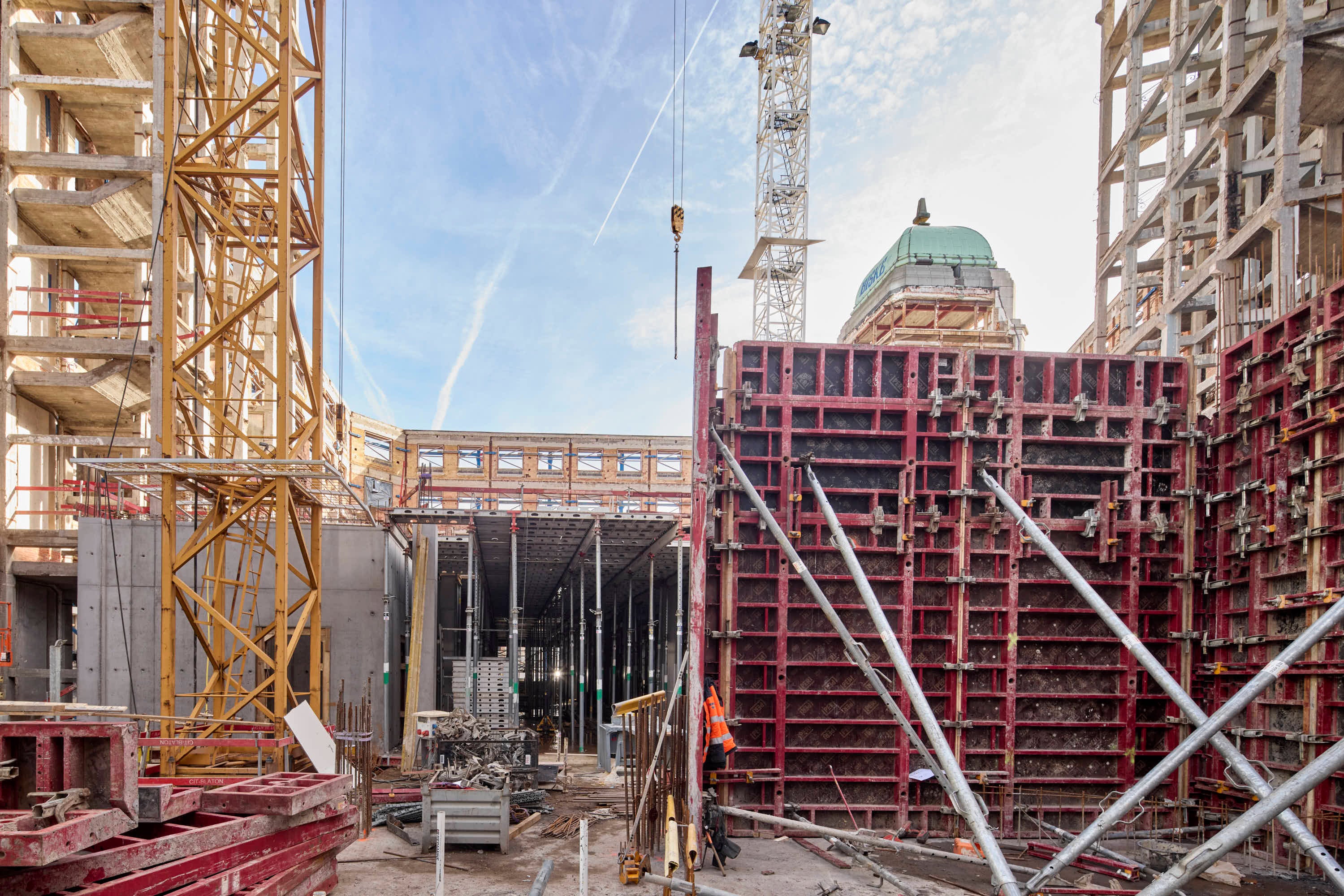 In het centrum van Brussel, vlak bij het iconische Beurspaleis, wordt het historische grootwarenhuis ‘Grands Magasins de la Bourse’ getransformeerd tot ‘The Dome’. Verspreid over een totale oppervlakte van 21.000 m² en negen bouwlagen zal dit duurzame gemengde complex tegen 2027 plaats bieden aan hypermoderne en flexibele horeca-, retail-, kantoor- en woonunits. Bij de realisatie van de nieuwe binnenstructuur in gewapend stortbeton doet hoofdaannemer CIT Blaton een beroep op diverse specifieke bekistingssystemen van PERI.